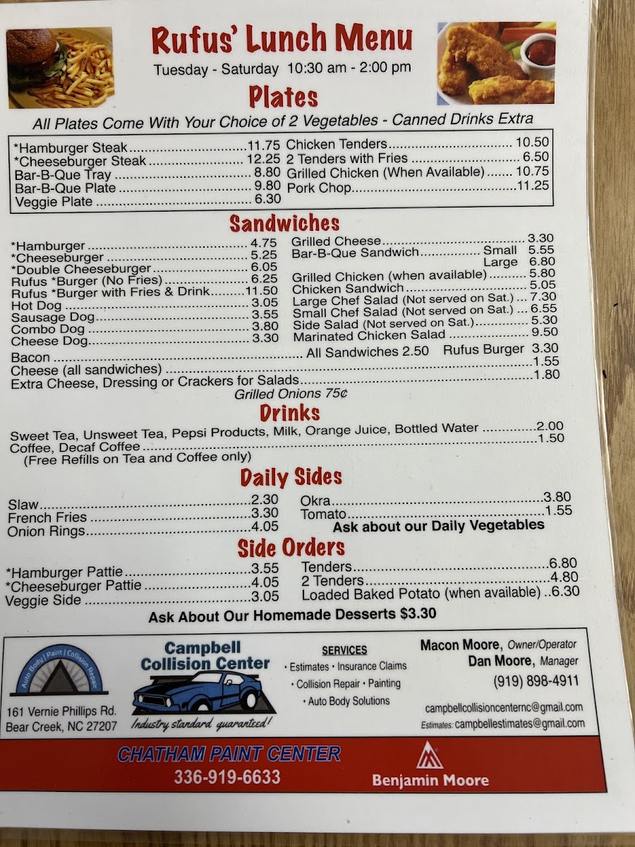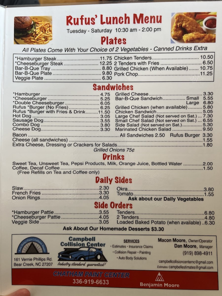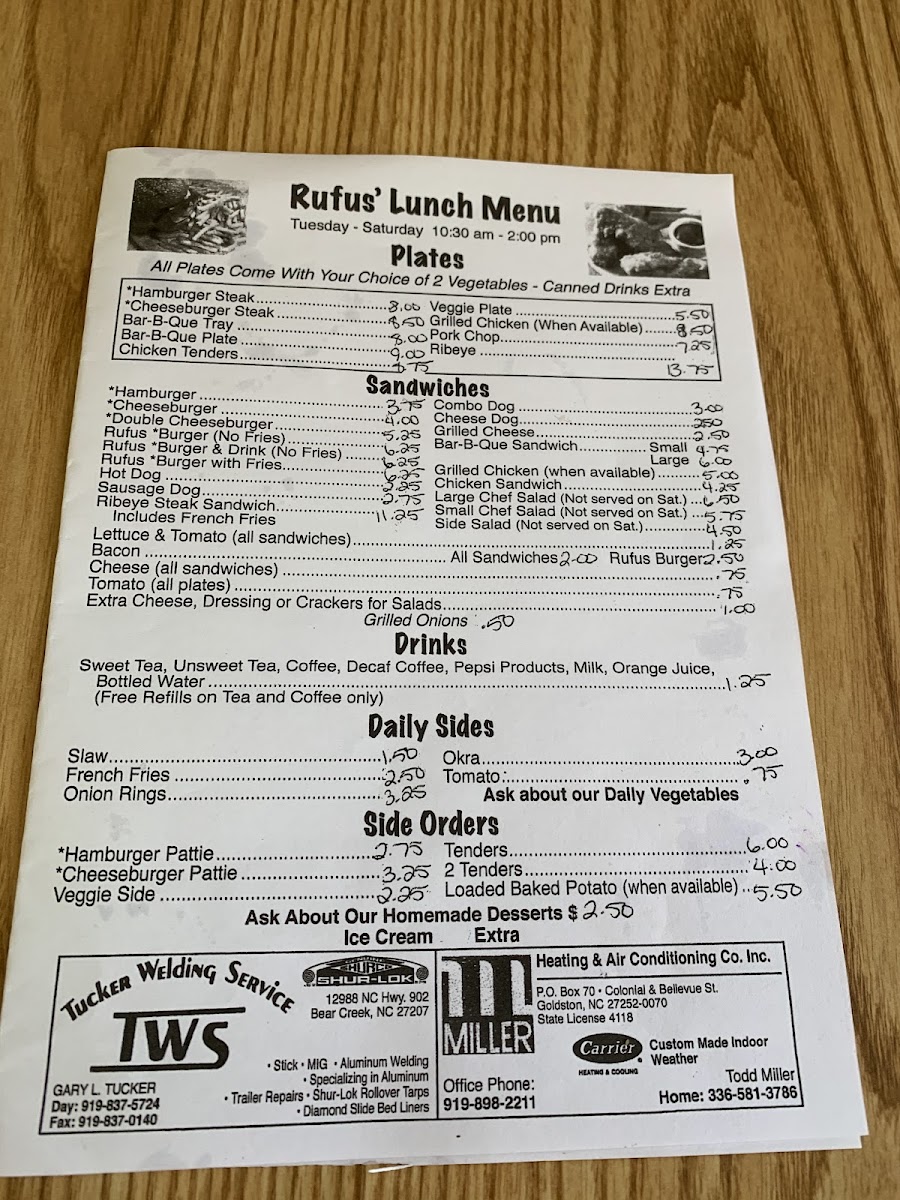 The menu at Rufus' Restaurant offers a straightforward, comforting selection of classic American dishes that bring a sense of home-cooked warmth to every visit. Rooted in traditional Southern flavors, this casual menu features everything from hearty breakfast biscuits and satisfying burgers to well-loved barbecue plates and simple vegetable sides. It’s the kind of place where you can stop by for a filling morning meal or settle in for a relaxed lunch or dinner.