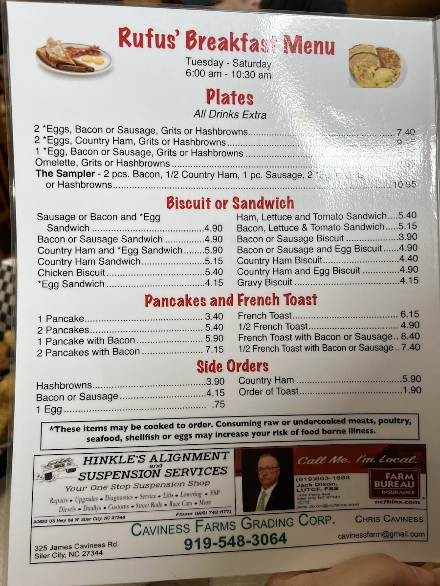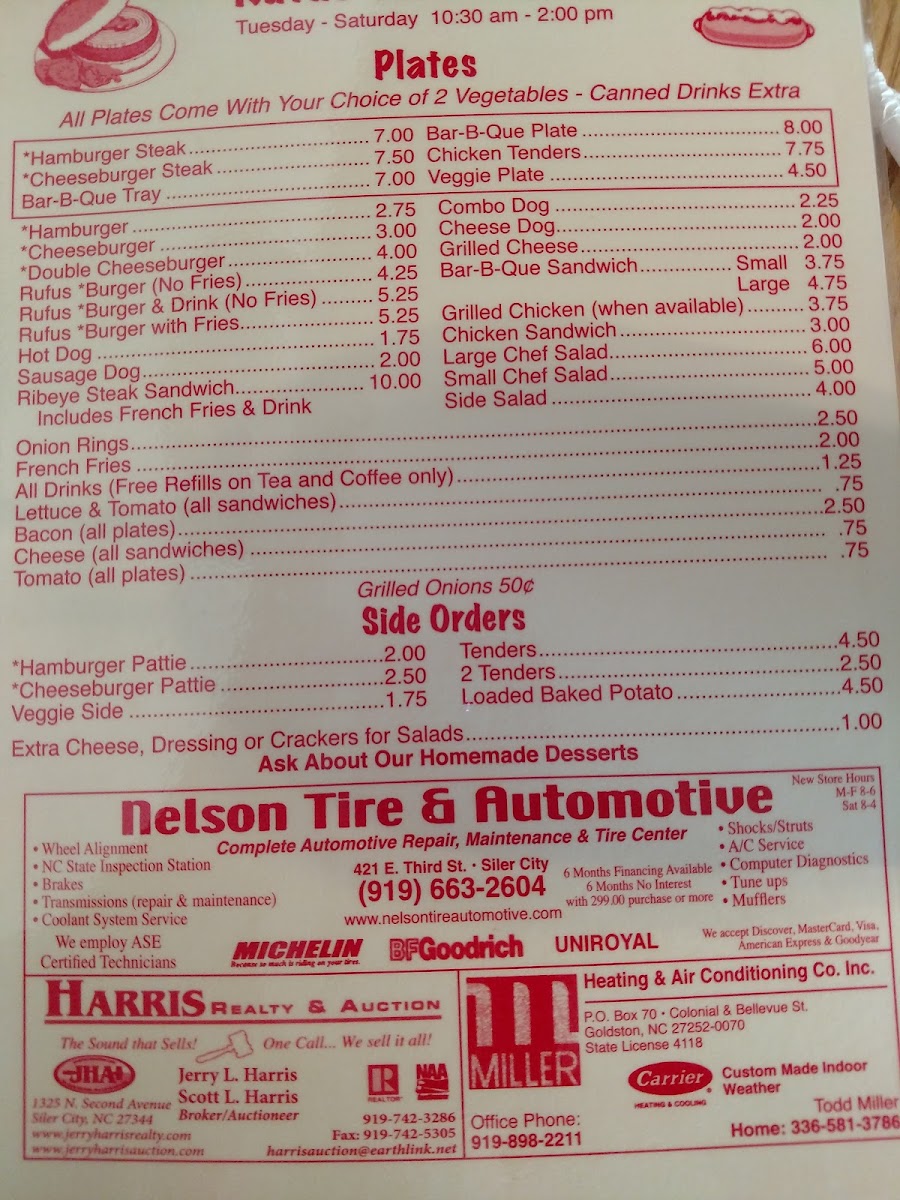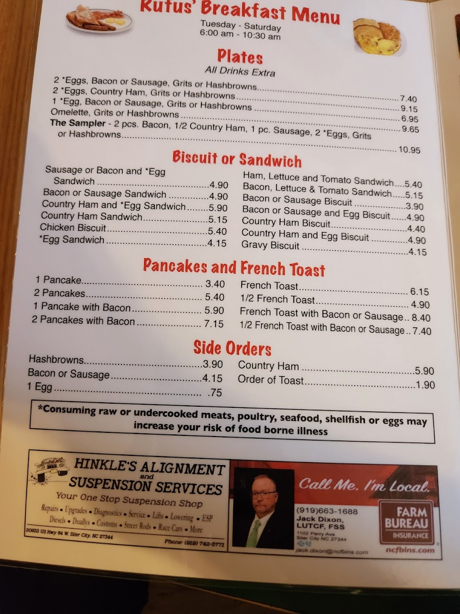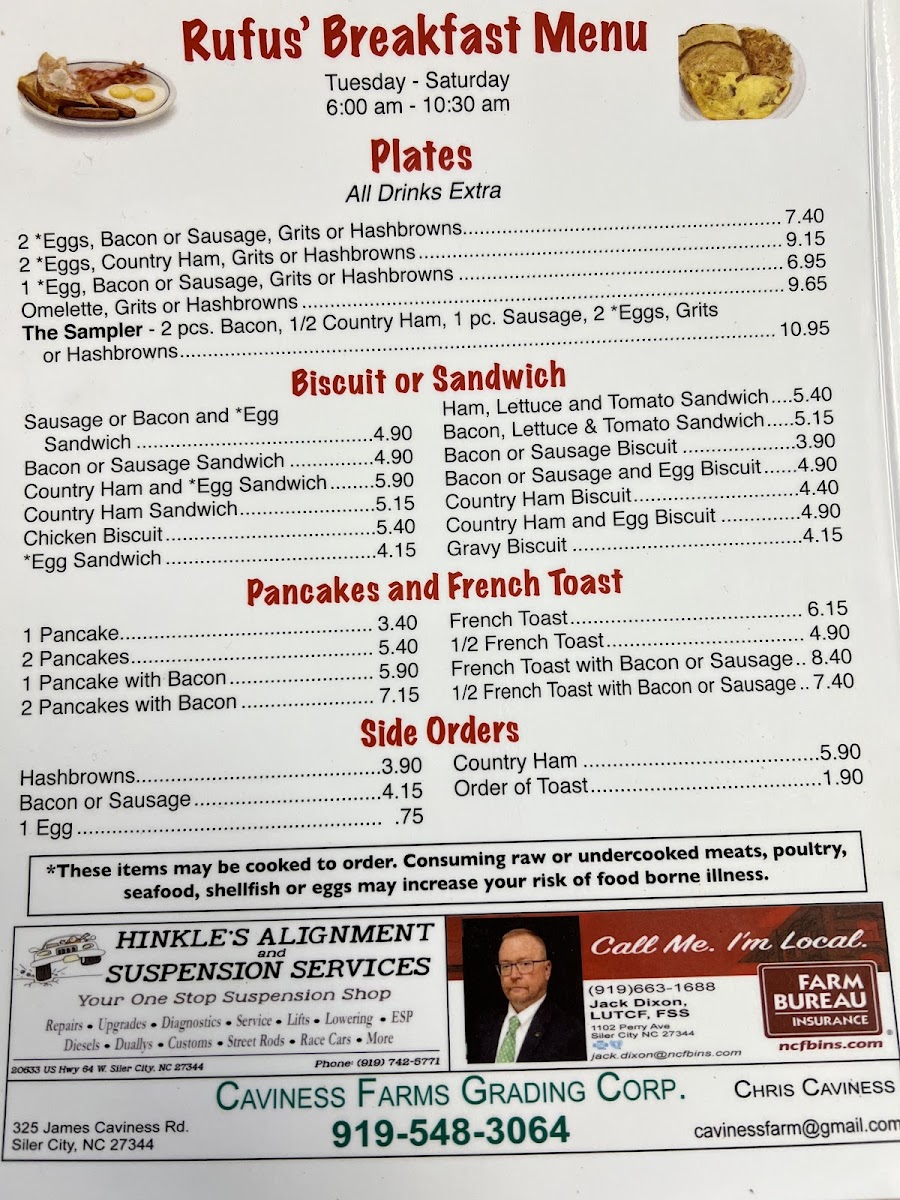 The menu at Rufus' Restaurant offers a straightforward, comforting selection of classic American dishes that bring a sense of home-cooked warmth to every visit. Rooted in traditional Southern flavors, this casual menu features everything from hearty breakfast biscuits and satisfying burgers to well-loved barbecue plates and simple vegetable sides. It’s the kind of place where you can stop by for a filling morning meal or settle in for a relaxed lunch or dinner.